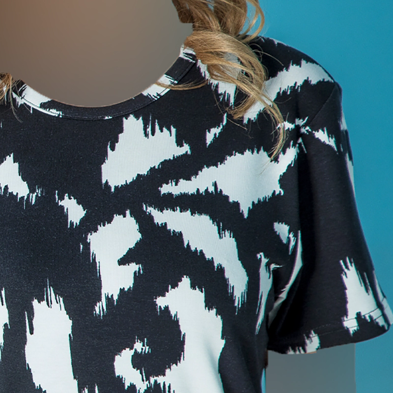 ویژگی های پیراهن زنانه آستین کوتاه یقه گرد طرحدار(سیاه و سفید)
